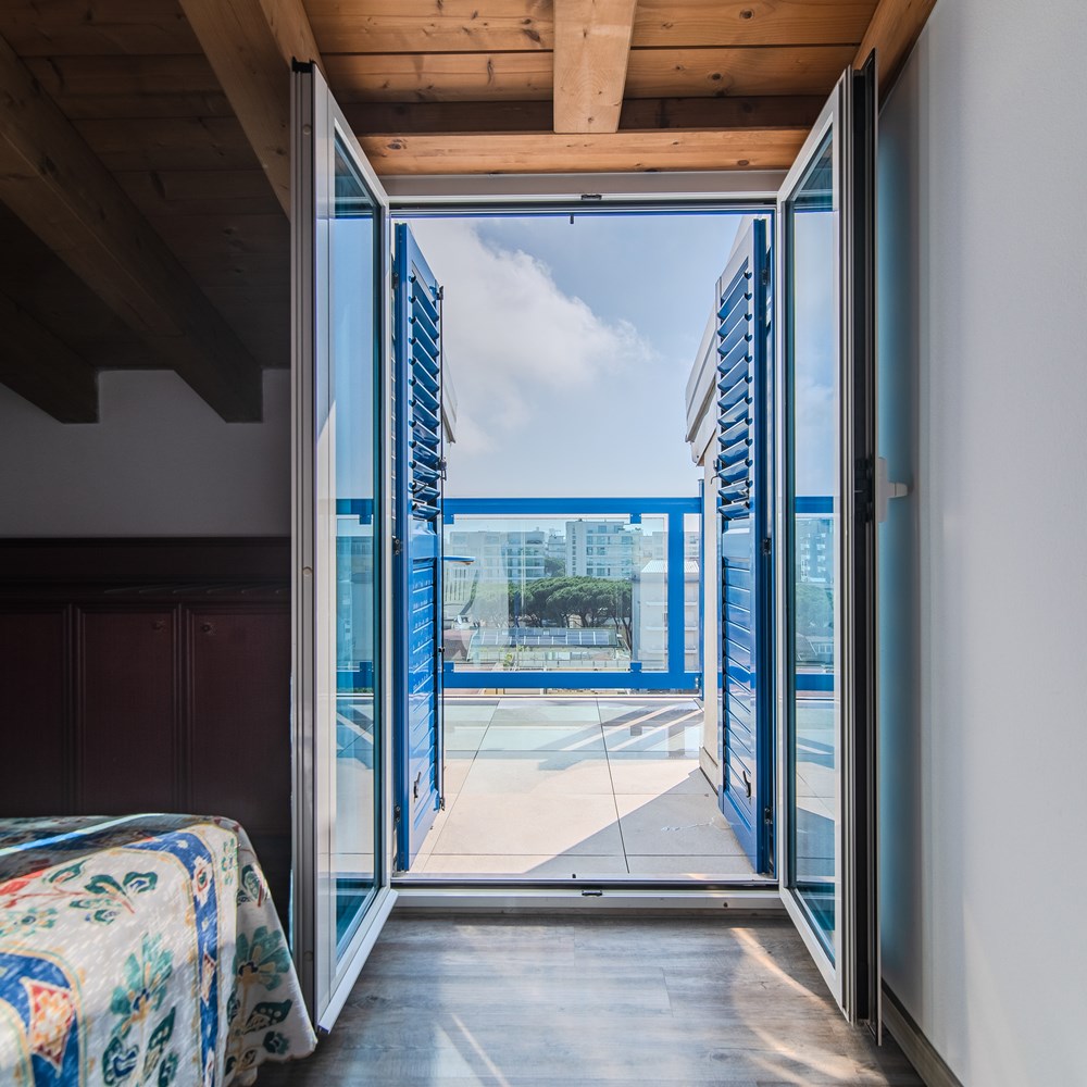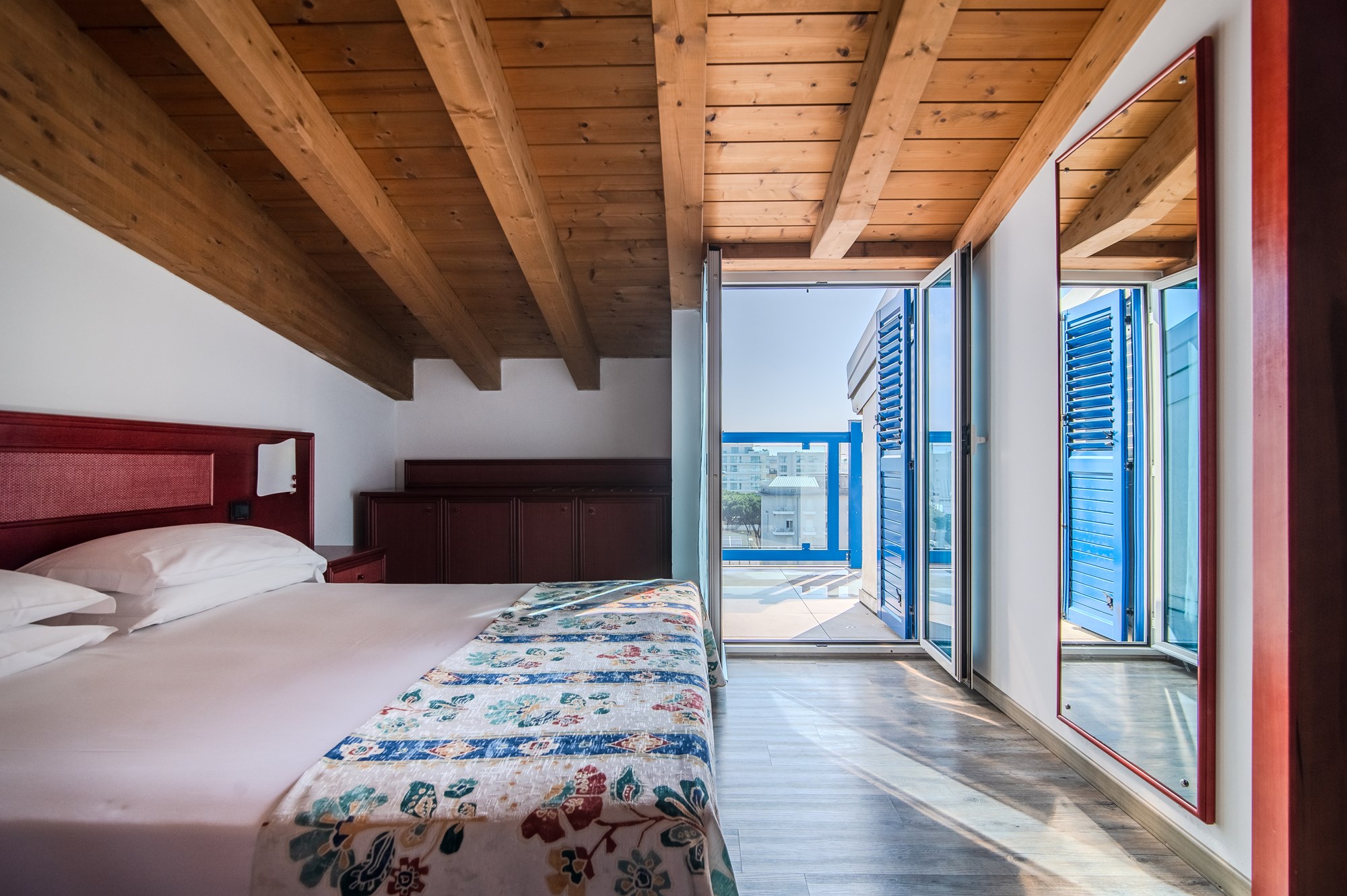 Die Vorzüge der Superior-Zimmer mit Mansarde sind zwei: der Balkon im 6. Stock mit einem herrlichen seitlichen Meerblick und die einladende Atmosphäre, insbesondere dank der Holzdecke.
